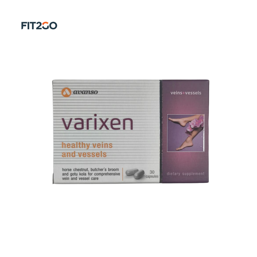 Avanso Varixen is a natural formula designed to support healthy circulation and alleviate symptoms of venous insufficiency. Combining the power of effective herbs such as horse chestnut, butcher's broom extracts, and gotu kola, it helps strengthen blood vessels and reduce discomfort. Enriched with Vitamin C, it further supports vascular health and promotes overall wellness. Ideal for individuals experiencing varicose veins, poor circulation, or other signs of venous insufficiency.